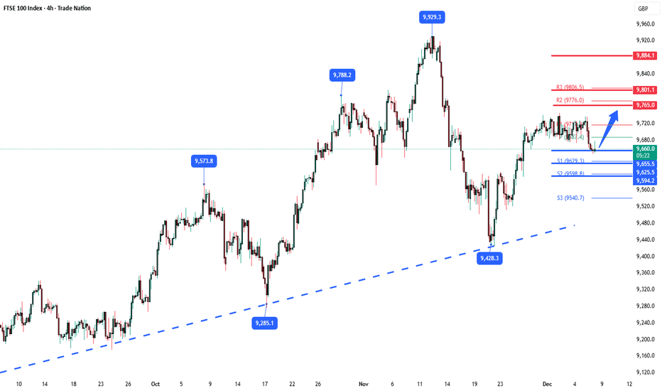 FTSE100 support retest at 9655The FTSE remains in a bullish trend, with recent price action showing signs of a breakout ...