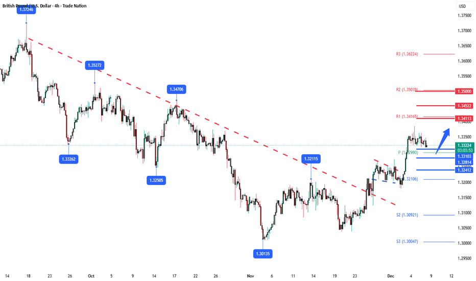 GBPUSD at pivotal 1.3310The GBPUSD remains in a bullish trend, with recent price action showing signs of a consolidation...